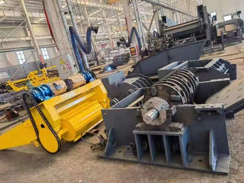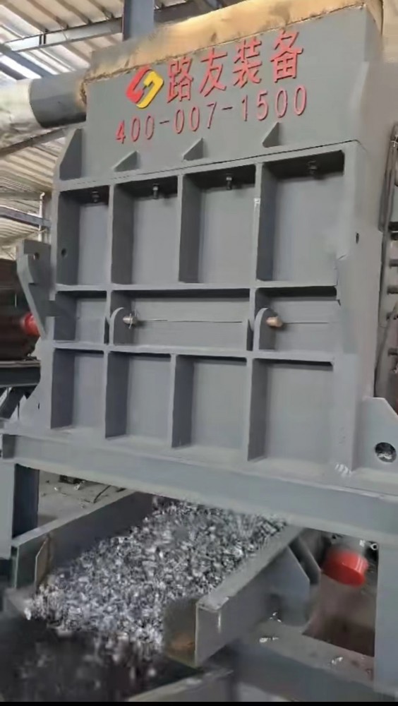 二:利用高速旋轉(zhuǎn)的葉輪將長的金屬屑攪撕折斷,高速旋轉(zhuǎn)(約1000轉(zhuǎn)/分鐘)的主軸上串聯(lián)著多片圓鋼板,圓板聯(lián)著主軸旋轉(zhuǎn)。圓板四周都裝有4~6個(gè)用錳鋼鑄成的小形齒輪。小齒輪在自己的小軸上自由地轉(zhuǎn)動(dòng)。長而亂成團(tuán)的金屬屑從頂口進(jìn)入機(jī)內(nèi),被高速轉(zhuǎn)動(dòng)的鋼板上齒輪絞動(dòng),撕打成小碎塊,由底部的篩孔流出篩孔大小可根據(jù)金屬屑要求的斷碎顆粒大小而選定。